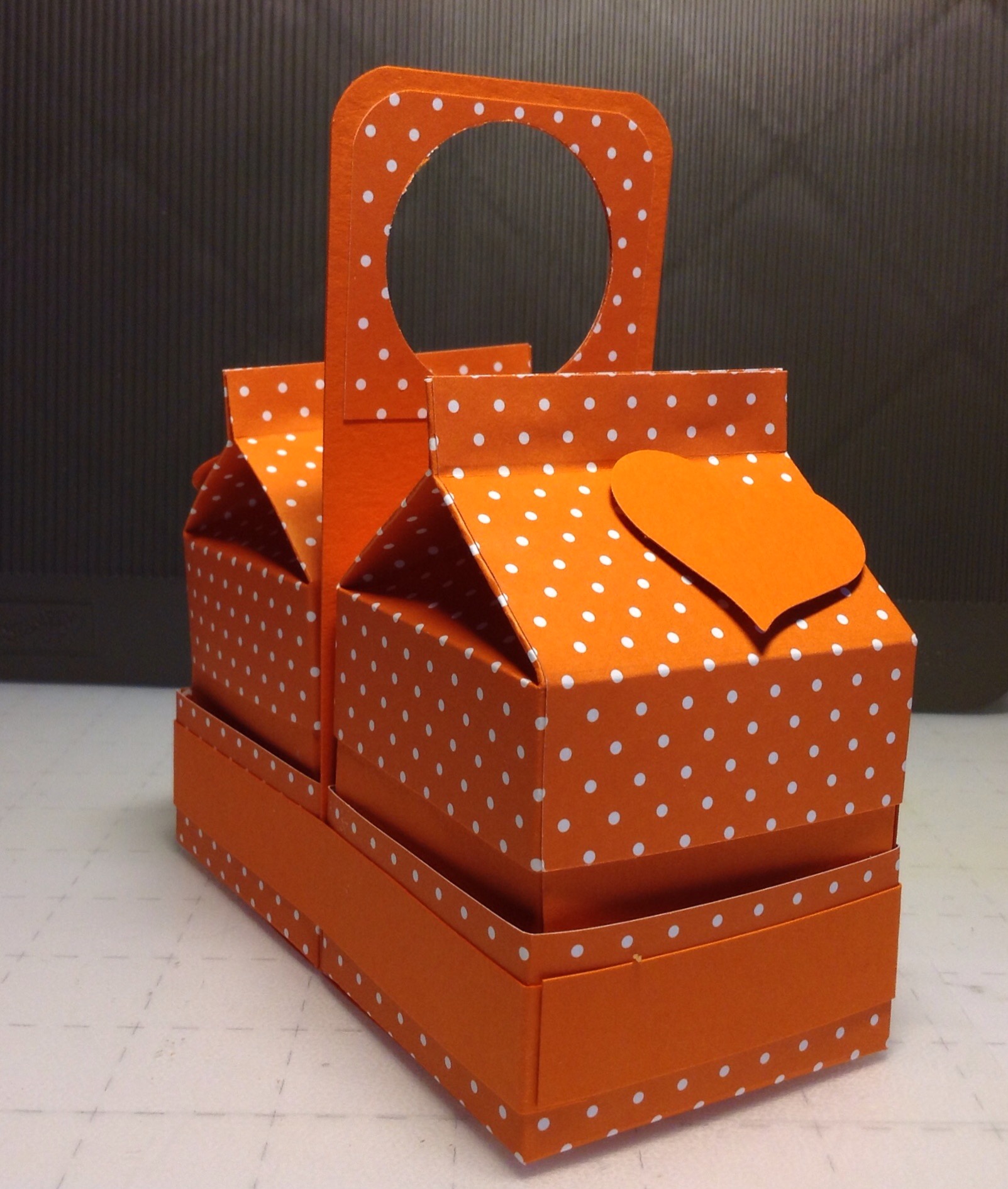 Snij uit beide vellen cardstock een stuk van 7 7/16 x 7 7/16, een reep van 8 1/4 x 2 1/2 en snij tenslotte een reepje van 8 1/4x 3/4. Dit zijn respectievelijk de bodem van het melkpakje, het handvat en de versteviging voor om de tray.