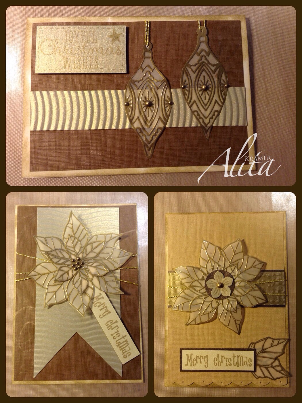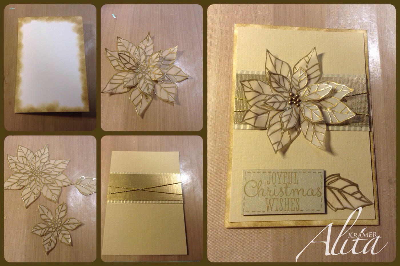 Met behulp van een witte kaart basis, vellum en wat resten papier heb ik deze chique kaart gemaakt. De poinsettia is twee keer met versamark gestempeld en daarna heat embossed met goud. Het middenstuk uitgeknipt waardoor er wat meer diepte in de kaart komt. De gebruikte inkt is baked brown sugar wat erg mooi uitkomt op het crème en goudkleurige papier. In het midden van de bloem wat plakparels.