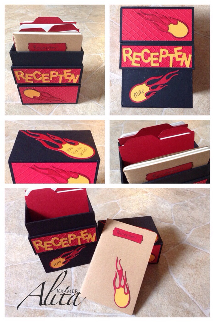 Van grijs dik karton heb ik het doosje gemaakt. Het deksel kan zowel bovenop als onderop, zodat het bij gebruik niet rondslingert. Ik heb ongeveer in het midden nog wat karton aangebracht waar het deksel op rust, hierdoor kunnen de tabbladen en de rest van de inhoud iets uitsteken boven het doosje. Het geheel na het lijmen zwart geschilderd en beplakt met Real red karton van stampin up (en de structuur aangebracht met een embossingfolder) wat vlammen uitgesneden en hiermee het doosje versierd. In het doosje zit een notitieboekje voor aantekeningen, tabbladen en lege pagina’s voor de recepten. Mijn man was er erg blij mee 🙂