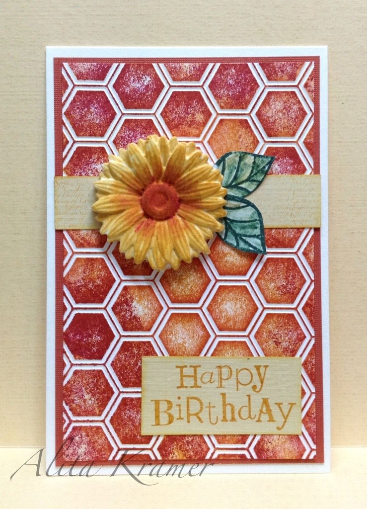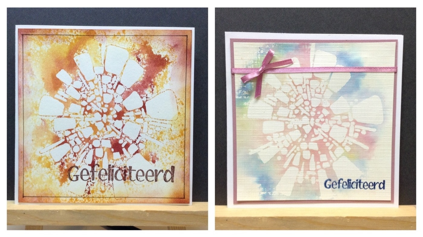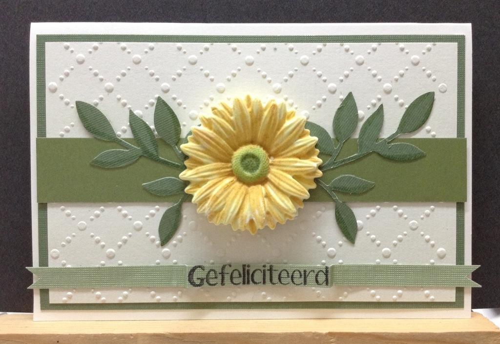 Deze keer de bloem verwerkt op een achtergrond die gemaakt is met een embossingfolder. Zodra je het papier uit de bigshot haalt, deze omdraaien en op de achterkant (!) kleur aanbrengen met een brayer. De debossed gedeeltes blijven dan wit. De bloem is ingekleurd met markers en inkt.