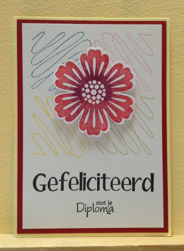 Vanavond had ik zin om een simpele, maar toch leuke kaart te maken. Eerst met een Club Scrap lijntjes stempel de achtergrond in 4 zachte kleuren gestempeld. Daarna de bloem van SU op een los stukje gestempeld met twee verschillende kleuren, rechtstreeks op de stempel aangebracht. de stempel afdruk met de blossom punch uitgestanst. Met 3D foam op de kaart geplakt. De tekst met zwarte inkt gestempeld. Het geheel op een rode achtergrond geplakt en dit op een licht gele kaart basis geplakt. Klaar .