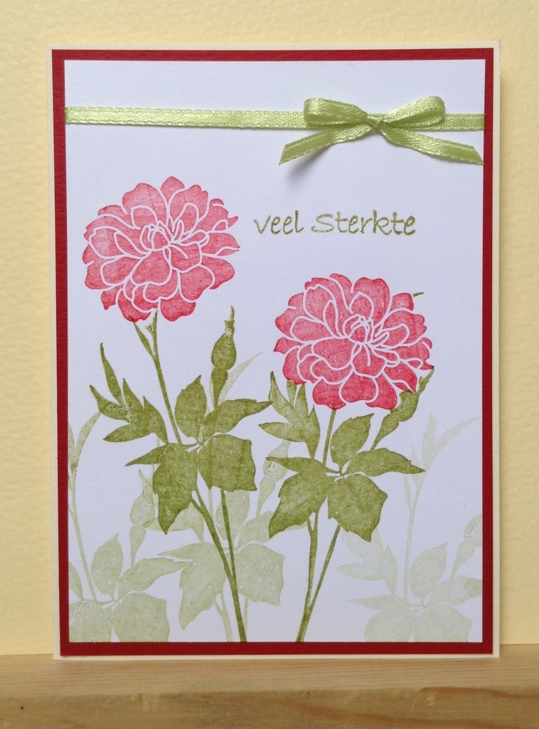 Deze kaart had ik oorspronkelijk op een soort vlies papier proberen te stempelen (naar aanleiding van youtube inspiratie) maar dat werd geen succes, dus besloten een stukje gewoon wit papier te pakken. Eerst de bloemen gestempeld, daarna masker van de bloemen gemaakt en de deze gebruikt om de groene takken netjes “onder” de bloemen te stempelen. Na elke volle afdruk, ook een aantal extra afdrukken van het groen gemaakt zodat ik verschillende intensiteiten van deze stempel op de kaart kreeg. Tenslotte de tekst in groene inkt gestempeld. Strikje om de kaart gebonden en het geheel op een rode ondergrond geplakt. Dit op een creme kaart basis bevestigd.