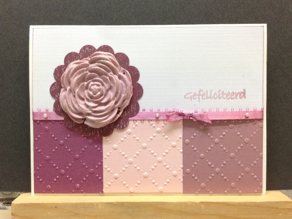 De kaart gemaakt met restjes papier, die ik met een sizzix embossing folder door de big shot heb gehaald. Bijpassend lintje erbij gezocht. De paperclay bloem was oorspronkelijk veel feller roze, maar vond dit toch niet zo mooi, dus heb ik deze met acryl verf van een zachtere tint voorzien. Klein beetje glitter en een scallop punch van stampin up. Tenslotte de groet toegevoegd en klaar.