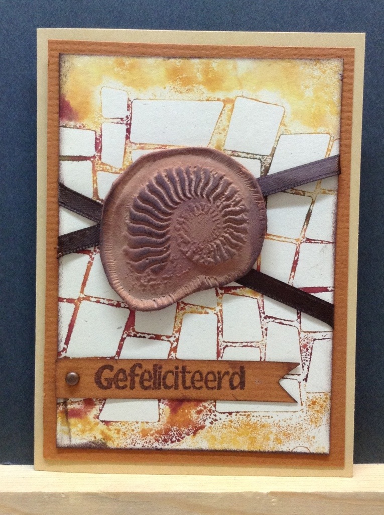 Deze kaart heb ik in etappes gemaakt. Ik had eerst met het stencil van Club Scrap gespeeld. De randen ingekleurd met inkt en toen met water de kleuren in elkaar laten lopen. Stuk papier op het stencil gelegd en daardoor de achtergrond gecreëerd. De achtergrond iets bijgesneden en een lint er omheen gewikkeld. De groet op een los stukje papier gestempeld en een splitpen toegevoegd. Het geheel op een stukje bruin papier geplakt, dit weer op de licht bruine kaart bevestigd. Tenslotte het fossiel vastgemaakt. Dit is gemaakt van een stukje paperclay waarin ik een Club Scrap stempel heb gedrukt. Het geheel laten drogen en toen iets bijgeknipt en inkt aangebracht om de details beter naar voren te laten komen.