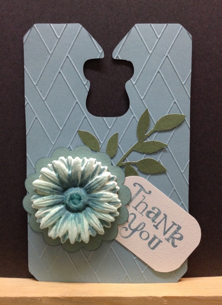 Een vergelijkbaar label zag ik als een die van Sizzix, maar ik kon deze ook snijden met mijn Cricut. Het formaat is 14 x 9 cm en is groot genoeg om aan een zak snoep, of om een dunne flessenhals te hangen. Het reliëf is aangebracht met een embossing folder van de “boekenvoordeel”, die hebben tegenwoordig ook heel veel leuke hobby materialen. De takjes zijn een sizzlits die van Sizzix en de scallop is van SU. De paperclay bloem is gemaakt met een malletje van Martha Stewart. De paperclay had ik al een tijdje liggen, dus die moest nodig op 🙂 Thank you stempel is van SU en deze is gekleurd met een marker ipv inkt. De bloem zelf eerst besprayed met lichte teal kleurige inkt en toen ingekleurd met een marker van SU. Als laatste wat glitter aangebracht.