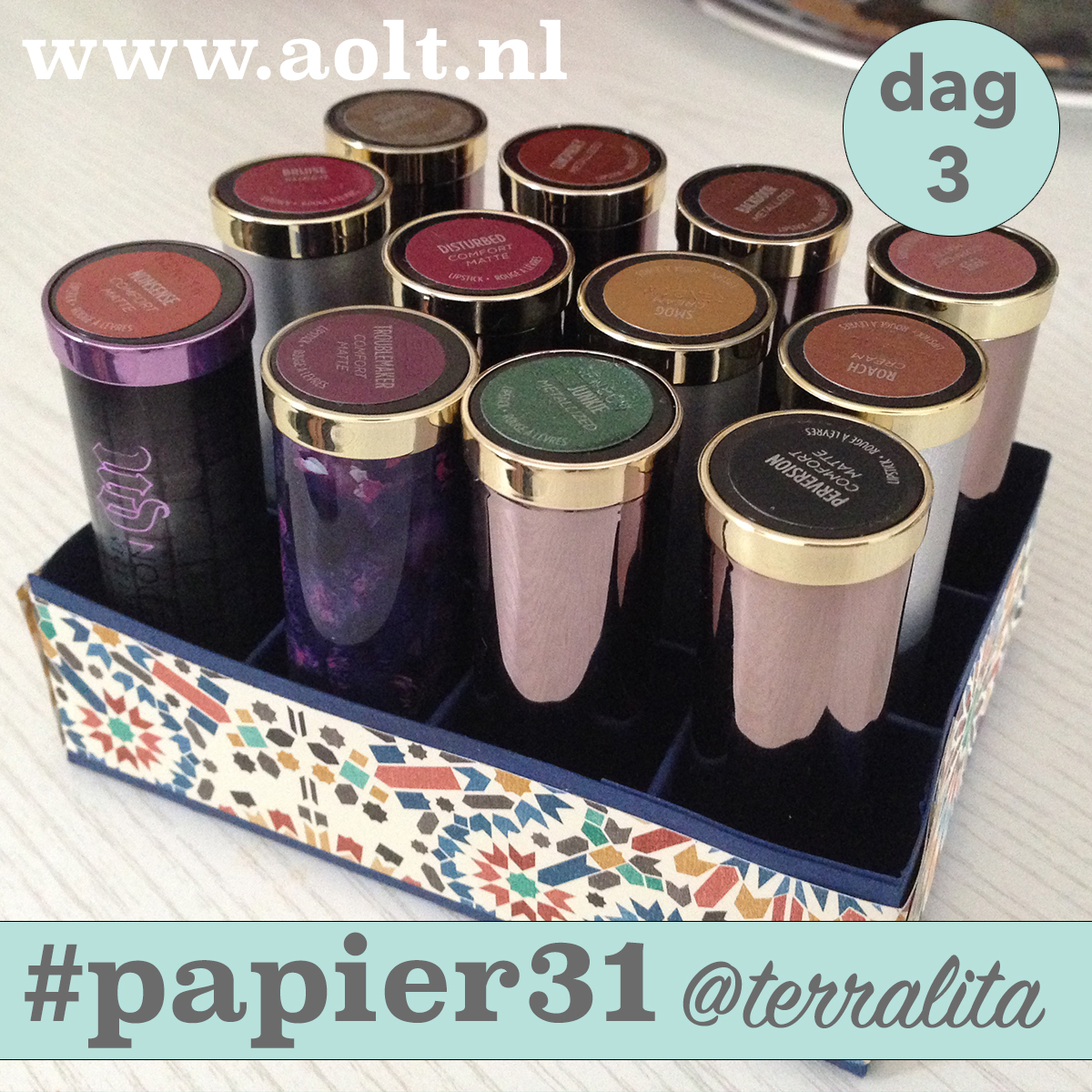 Vandaag maken we een lipstick houder voor 12 lipsticks. De basis is het vel 15×15 papier en een dik vel a4 papier.