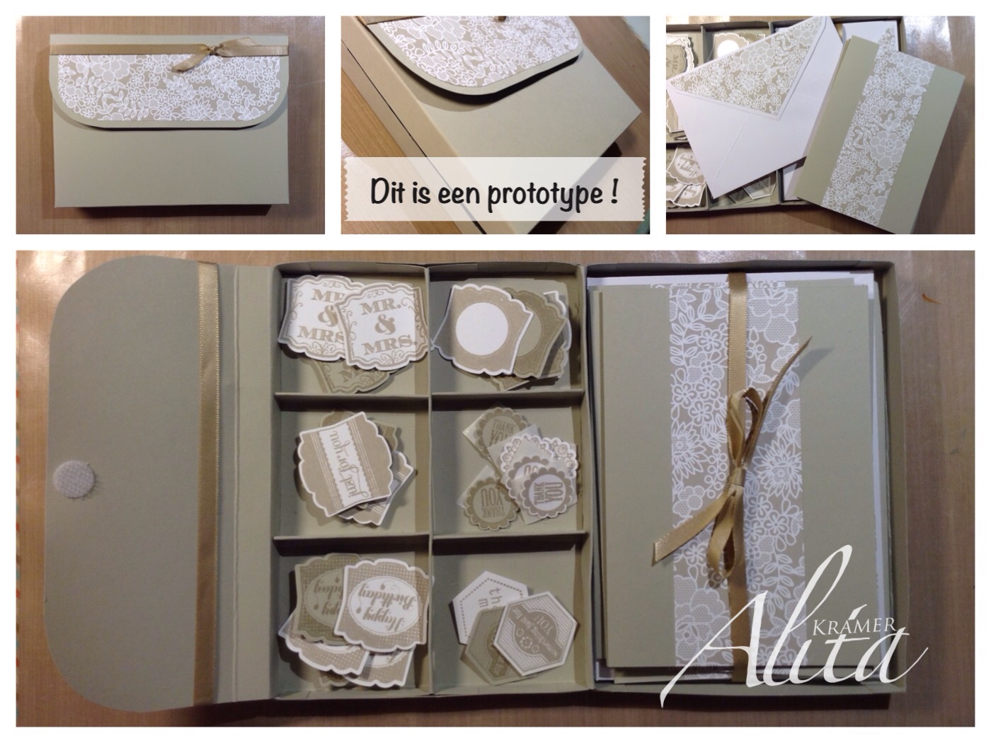 Dit was trouwens mijn prototype, deze heeft nog niet de sluitflapjes boven de labels en heeft andere enveloppen, maar zo kun je het doosje in een ander kleurencombi zien.