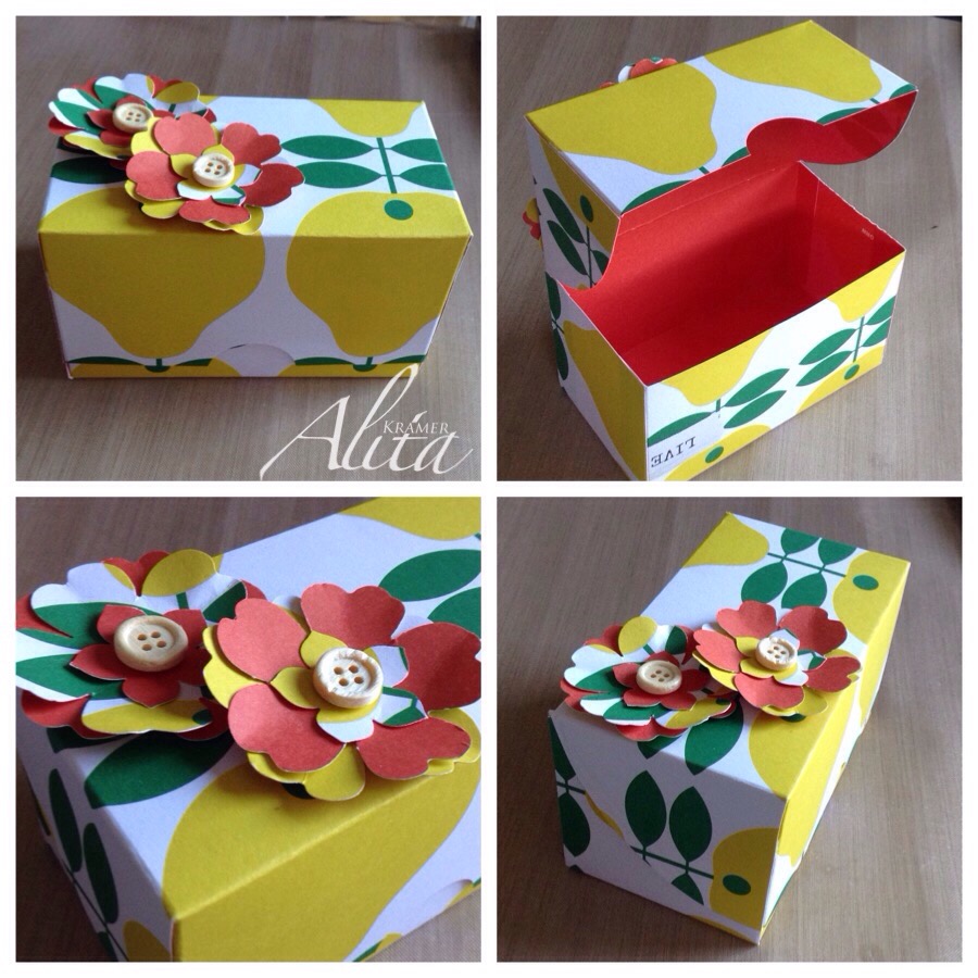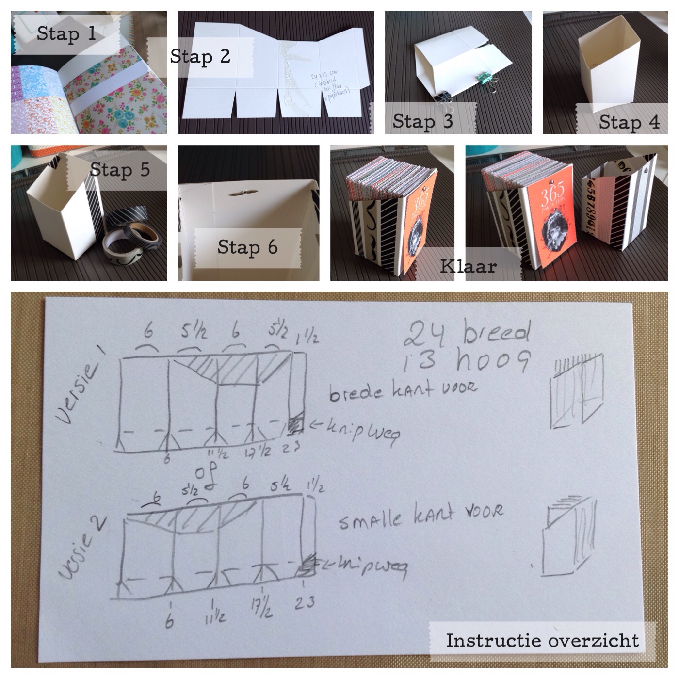 De tussen bladen zijn 22 bij 28 cm en ril deze op 5,7 – 11,4 – 17,1 en 22,8 cm Draai het een kwartslag en ril op 5,7 draai het 180 graden en ril nog eens op 5,7 cm. Knip de zijkanten in en knip de overtollige stukken weg (hier kun je de bloemetjes van maken. Maak de zijkanten van het deksel rond. Sorry, de uitleg is wat summier want ik had geen foto’s van de tussenstappen. Wil je meer uitleg? Stuur een berichtje.