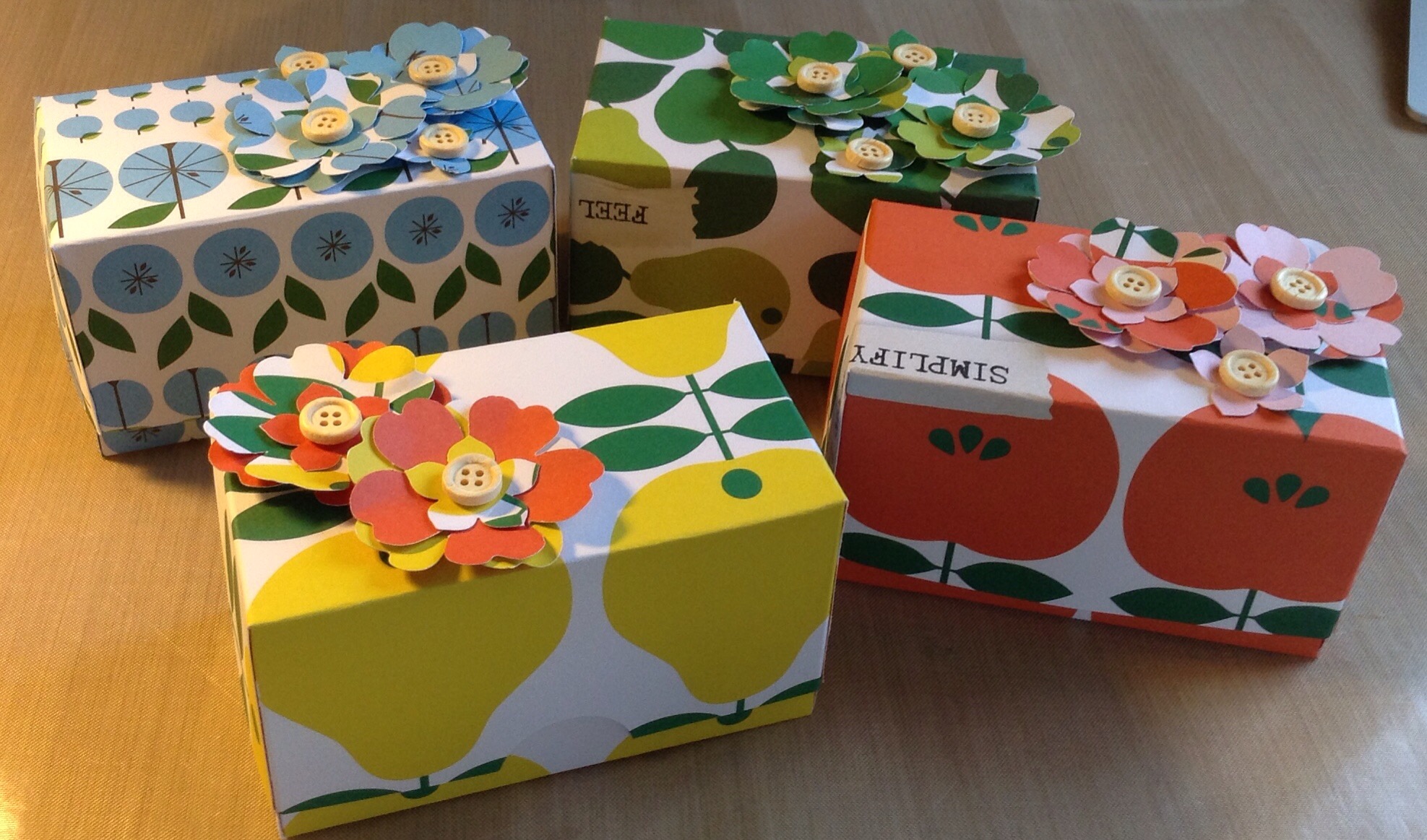 Leuke doosjes gemaakt met de stevige tussenbladen uit nummer 6. Bloemetjes zijn met een pons van Stampin Up gemaakt.