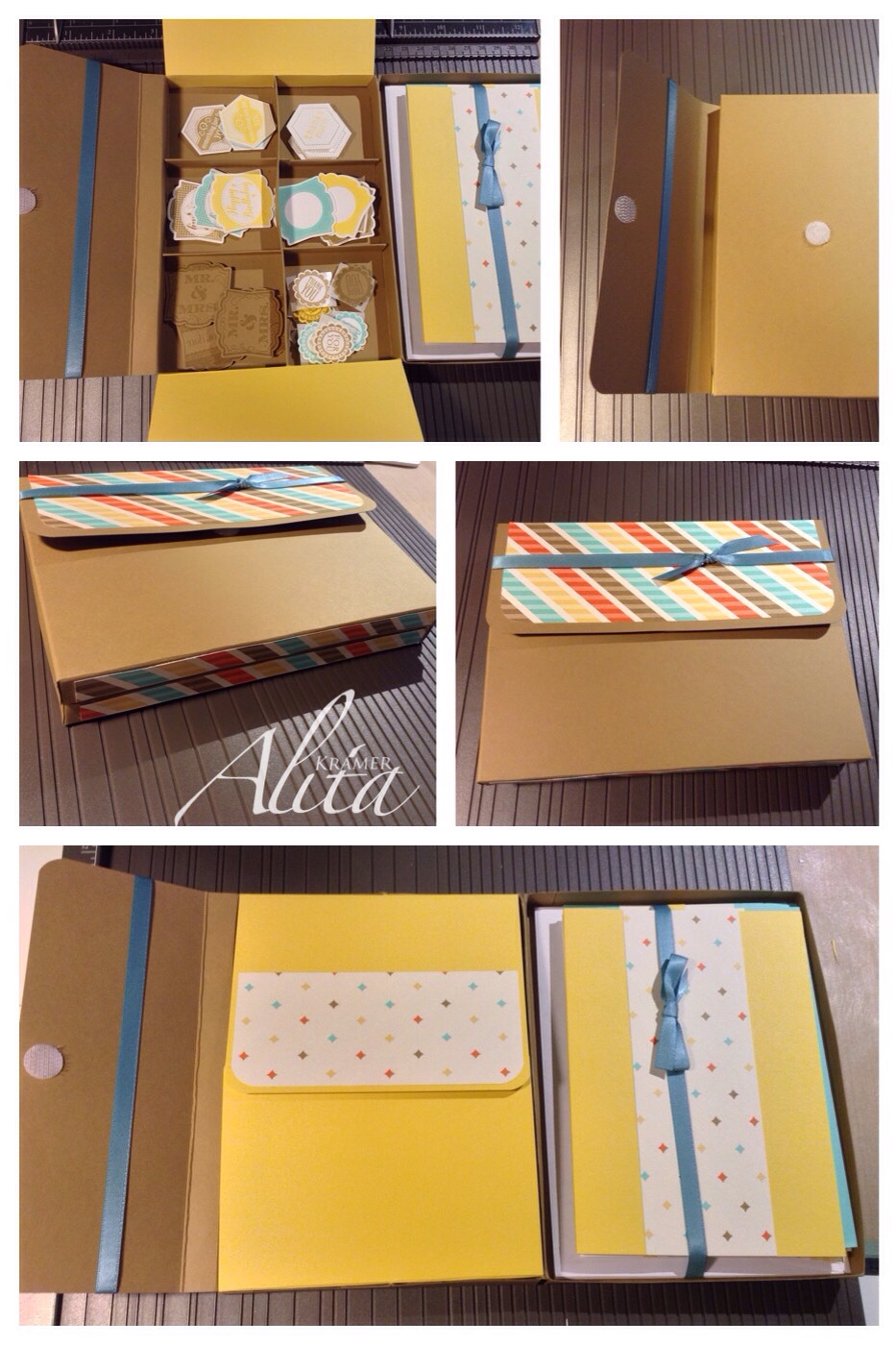 – Versier de kaarten en enveloppen naar keuze en plaats deze in het doosje en maak deze met het lint vast.