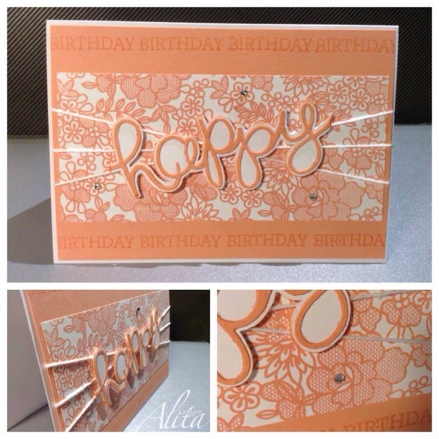 Het eerste project is een kaart gemaakt met de Crazy about You stempelset en de Hello You thinlits dies. Ook heb ik de mooie Something Lacy achtergrond stempel gebruikt. De inkt en het papier is Crisp Cantaloupe. Ik heb het woord Happy gestanst en toen op Whisper white papier geplakt en uitgeknipt omdat ik het woord eerst niet genoeg op vond vallen, ik heb het opgeplakt met wat Stampin Dimensionals. Tenslotte wat Bakers twine en Rhinestones gebruikt als extra versiering.