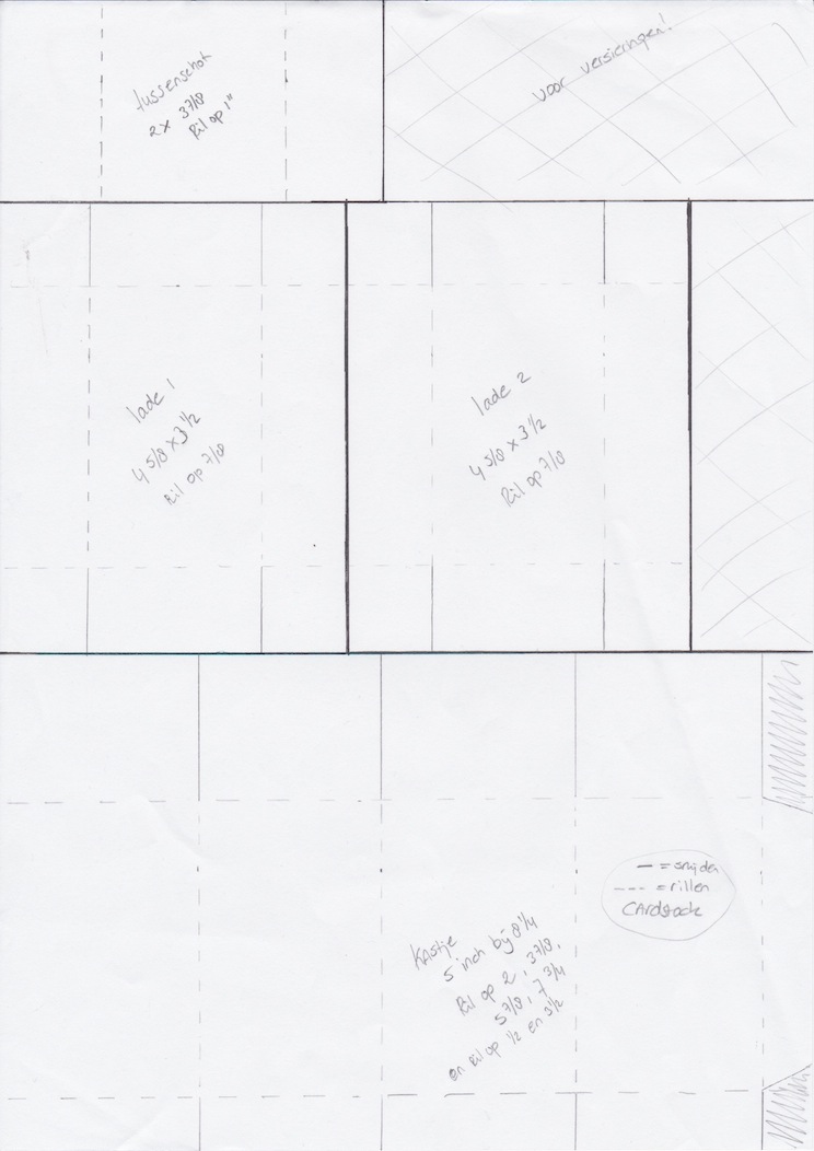 Het stuk van 5 x 8 1/4, het kastje, ril je op 2, 3 7/8, 5 7/8 en 7 3/4. daarna draai je het papier een kwartslag en ril je het op 1/2 en 3 1/2. De stukken van 4 5/8 x 3 1/2 zijn de lades en ril je rondom op 7/8 inch. Het stukje van 2 x 3 7/8 is het tussenschot en ril je op 1 inch, draai je 180 graden en nog eens op 1 inch rillen.