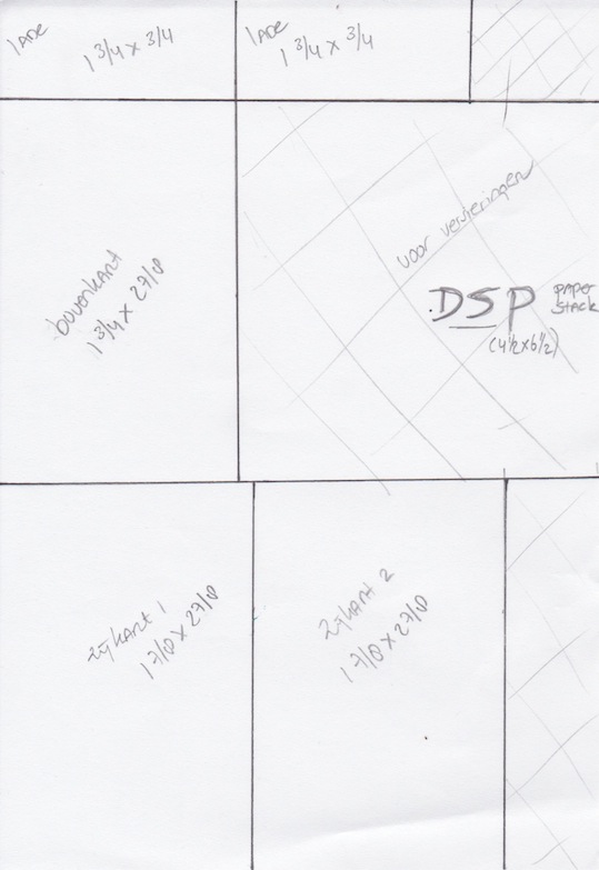 Je hebt een vel A4 cardstock en een velletje DPS van de paper stack nodig,  Hieronder ook twee afbeeldingen hoe je precies moet snijden en rillen. Je begint met het A4 vel en snijdt een stuk van 5 x 8 1/4 inch, twee stukken van 4 5/8 x 3 1/2 en een stukje van 2 x 3 7/8. Van het vel DSP snijdt je twee stukken van 1 7/8 x 2 7/8, 1 stuk van 1 3/4 x 2 7/8 en twee stukjes van 1 3/4 x 3/4.  De restanten kun je voor versieringen gebruiken. we gaan nu de stukken rillen.