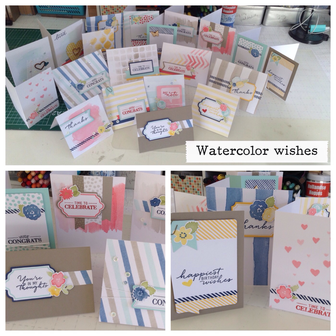 ik weet niet hoe jullie het hebben maar ik gek op complete kits en pakketjes. Ik mag natuurlijk ook graag zelf iets bedenken, maar het open maken van een doos vol bijpassende spulletjes is geweldig. In de nieuwe catalogus van Stampin up staat nu een prachtige set, de Watercolor wishes, het enige wat je nog nodig hebt is een goede lijm, maar voor de rest zit alles er in, kaarten, enveloppe, inkt, stempels, blok, foam en versieringen. Ik ben iets afgeweken van de instructies, maar dit is mijn eind resultaat.  Wil je ook zo’n leuke kit? Je kunt hem bij me bestellen, net als alle andere SU spulletjes.